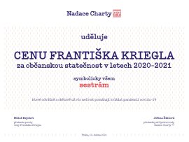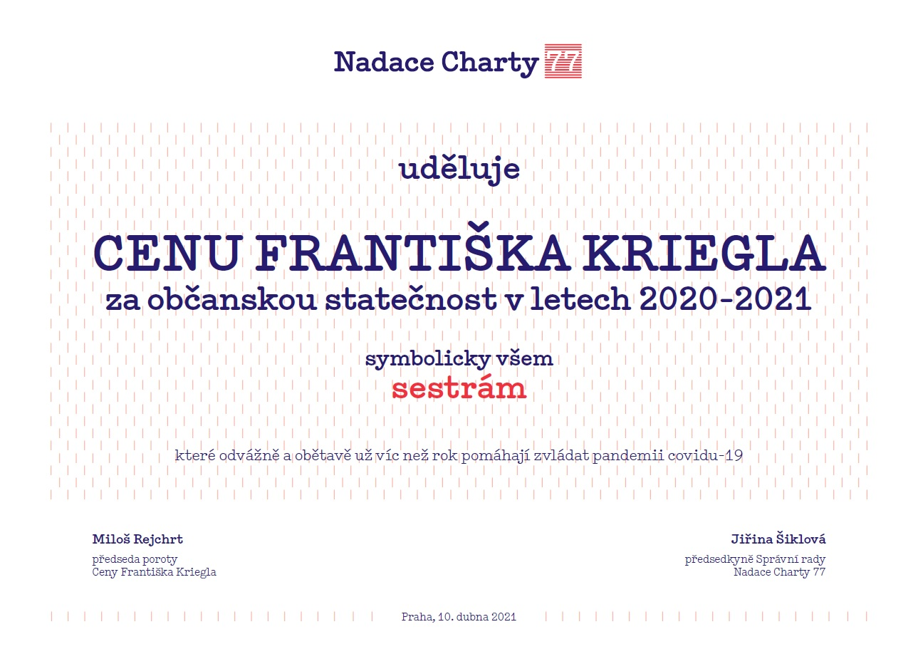Výrazem ocenění této práce je i cena Nadace Charty 77, která udělila Cenu Františka Kriegla za občanskou statečnost v letech 2020 – 2021 symbolicky všem sestrám.