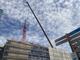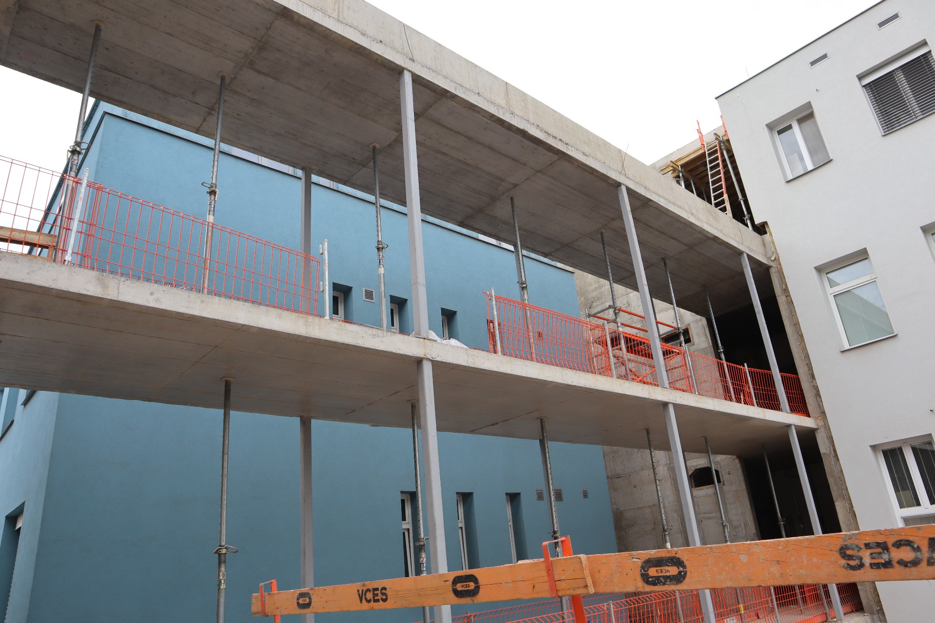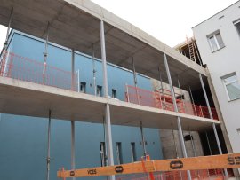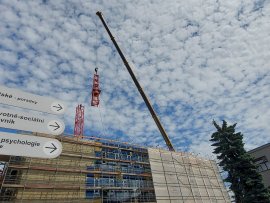 Čilý ruch vládne také na lešení, které obepíná novou budovu. „Namontováno je již více jak 40 % z celkové plochy prosklené fasády,“ přiblížil dění na stavbě Jaroslav Masopust, project manager generálního dodavatele stavby společnosti VCES a. s. „Uvnitř budovy kompletujeme strojovnu vzduchotechniky, kotelnu, rozvodnu a úpravnu vody,“ doplnil Masopust.