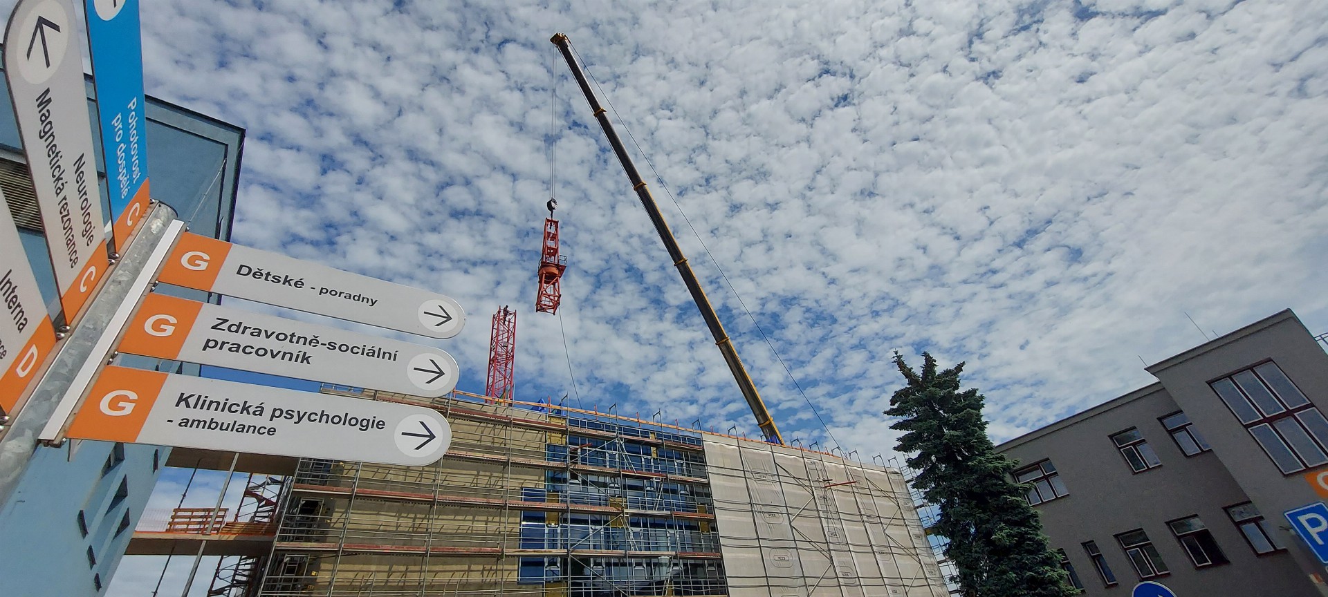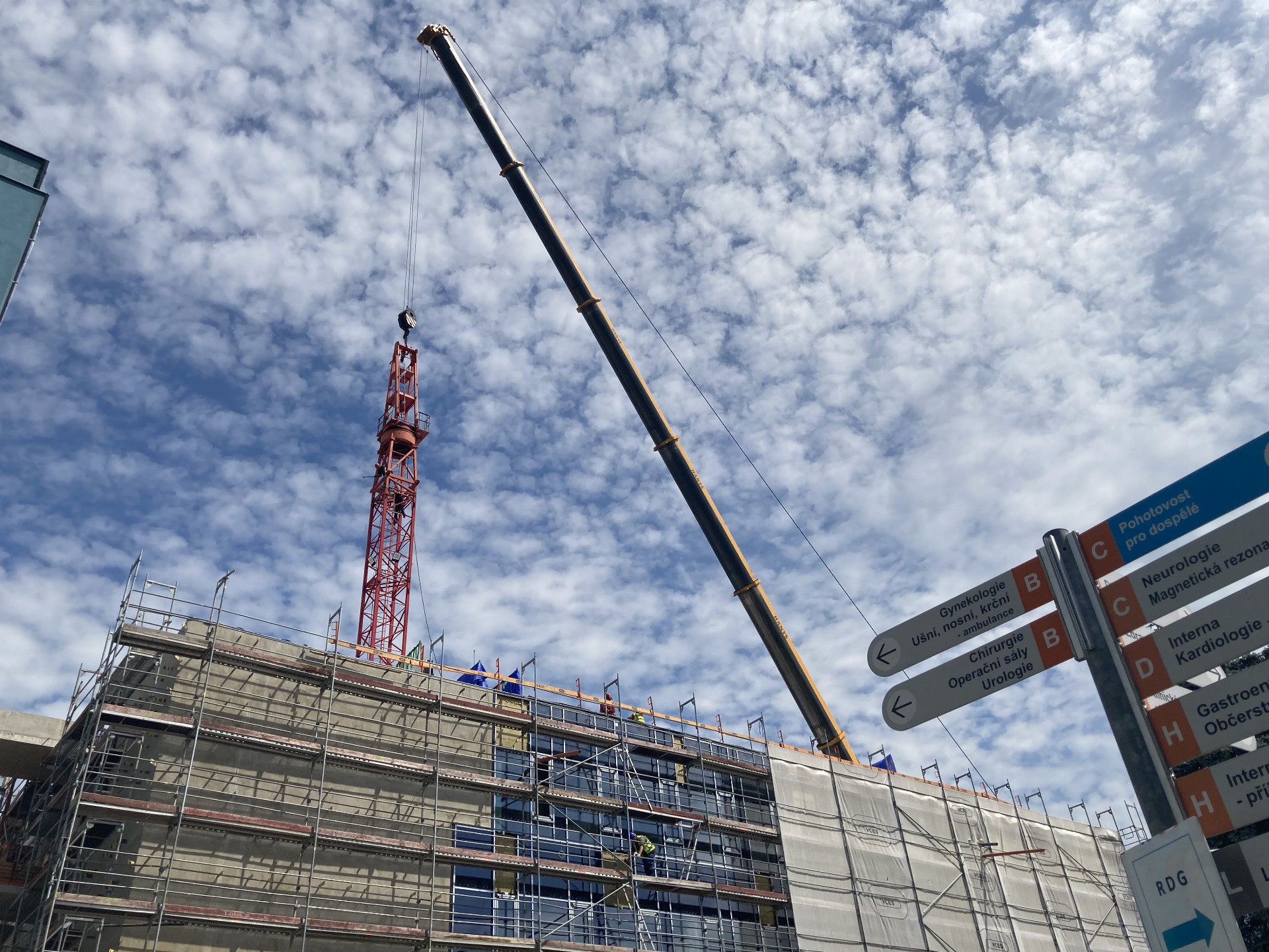 Z vnitřku budovy v pondělí také zmizel po deseti měsících intenzivní práce věžový jeřáb, kolem kterého za poslední měsíce stavba vyrostla. „Vysvobodit“ ho přijel jeden z největších mobilních jeřábů v České republice. Z objektu centrálního příjmu s třemi nadzemními a jedním podzemním podlažím byl věžový jeřáb během osmi hodin po částech vytažen a odvezen na čtyřech kamionech. Pro zvedání břemen do výšky teď budou na stavbě sloužit už jen klasické mobilní jeřáby. Uvolněná šachta se využije pro svedení rozvodů vzduchotechniky.